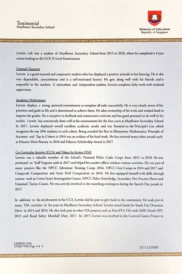 Graduated with Net 6 pointer. Took National Police Cabet Corps (NPCC) as a Co-corricular Activity, and